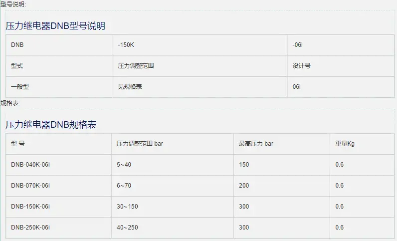 壓力繼電器DNB有如下型號(hào):DNB-040K-06i,DNB-070K-06i,DNB-150K-06i,DNB-250K-06i。