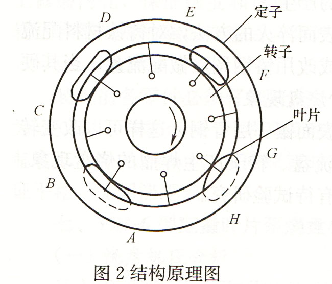 將損壞的液壓泵進行解剖,發(fā)現(xiàn)定子曲線內(nèi)表面嚴重磨損(見圖2)。定子由合金鋼制成,其內(nèi)表面由四段圓弧及四段過渡曲線組成,滑道曲面經(jīng)硬化處理(滲碳或氮化)并磨光,以承受葉片端部的滑磨及接觸應(yīng)力。葉片由熱處理后具有高硬度的鋼材制成,其與滑道接觸的一端通常制成光滑的圓角。解剖發(fā)現(xiàn)排油區(qū)AB、EF兩段弧磨損最為嚴重,已磨出溝槽,葉片前端(與定子接觸端)有摩擦亮痕。