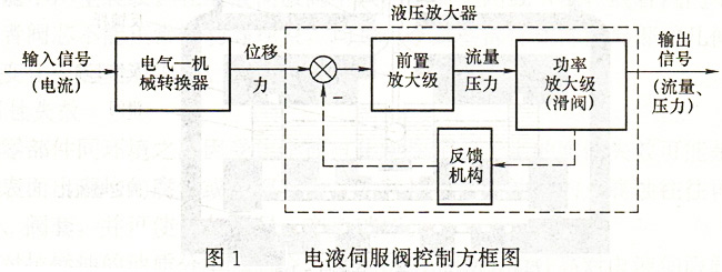電液伺服閥由電氣一機械轉(zhuǎn)換器和液壓系統(tǒng)放大器構(gòu)成,如圖1所示。電氣一機械轉(zhuǎn)換器是將電信號轉(zhuǎn)換成機械位移;液壓放大器是將電氣一機械轉(zhuǎn)換器輸出的機械位移放大后推動閥芯運動,液壓放大器由前置放大級和功率放大級組成,前置放大級采用滑閥、噴嘴擋板閥或射流管閥,功率級采用滑閥形式。